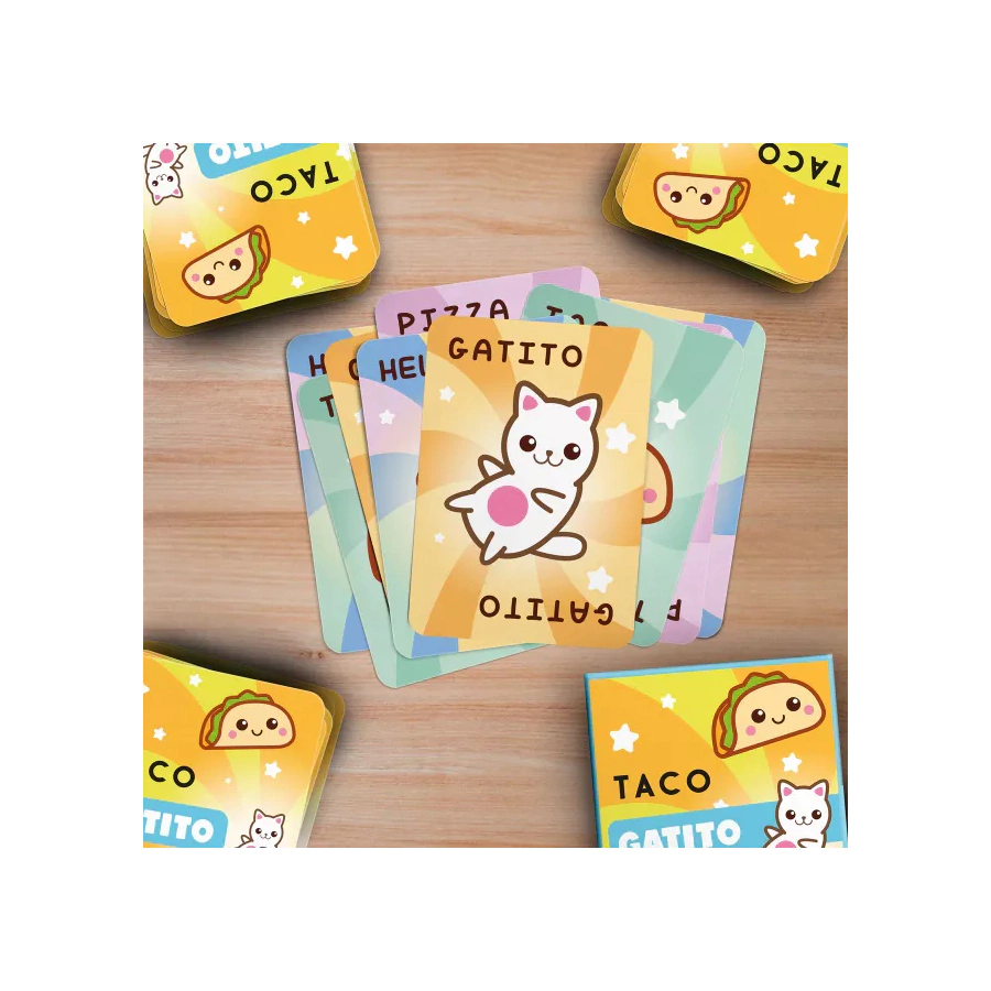 ¿Cómo se juega? El juego es sencillo y dinámico: los jugadores deben decir en voz alta una de las tres palabras del nombre del juego (taco, gatito o pizza) y luego dar vuelta una carta. Si coincide, ¡pueden jugar de nuevo! Pero cuidado con el Helado, porque al aparecer, todos deben poner las manos arriba de la carta; el último en hacerlo se lleva todas las cartas.