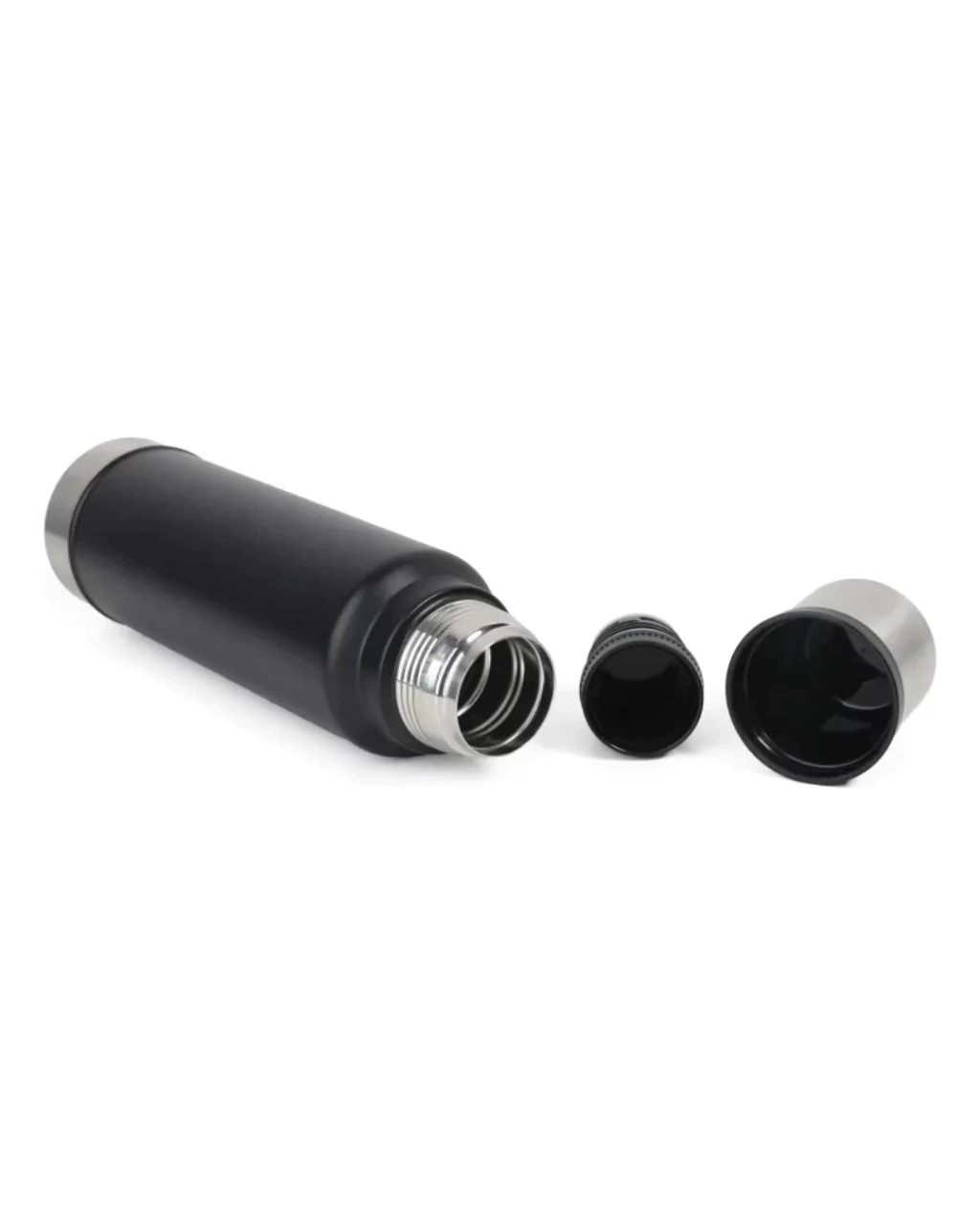 La manija plástica rebatible y resistente facilita el transporte, mientras que la tapa externa de acero inoxidable puede utilizarse como vaso, y la tapa interna de PP con sistema de rosca garantiza un cierre hermético.