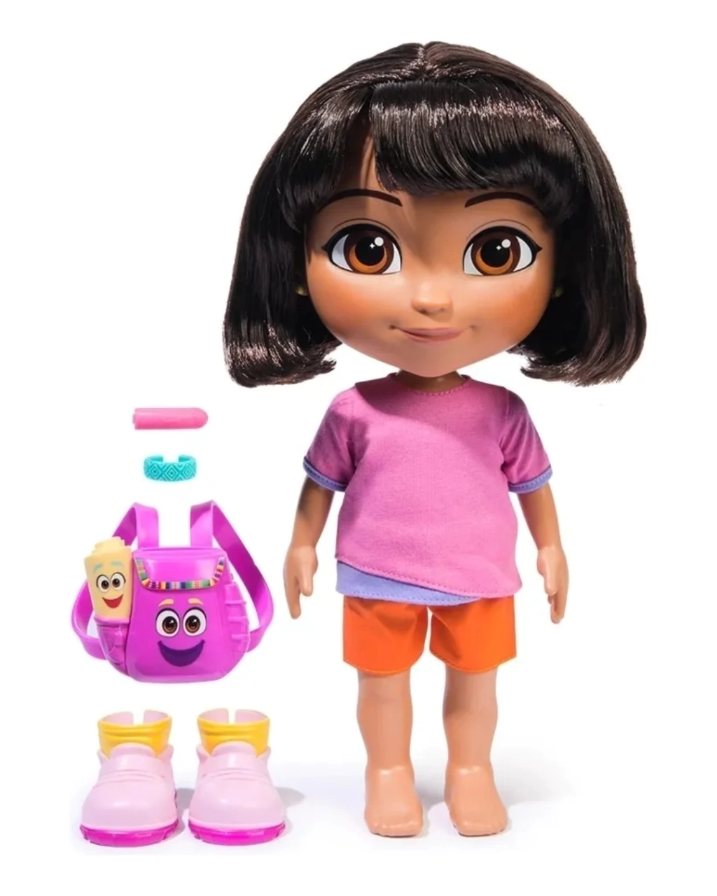 ¡Acompañá a Dora La Exploradora en nuevas aventuras llenas de aprendizaje y diversión! Esta muñeca articulada de 30 cm cuenta con pelo real para peinar, ropa y botas removibles, y viene equipada con su clásica mochila con mapa, una hebilla y una pulsera para personalizar su look.