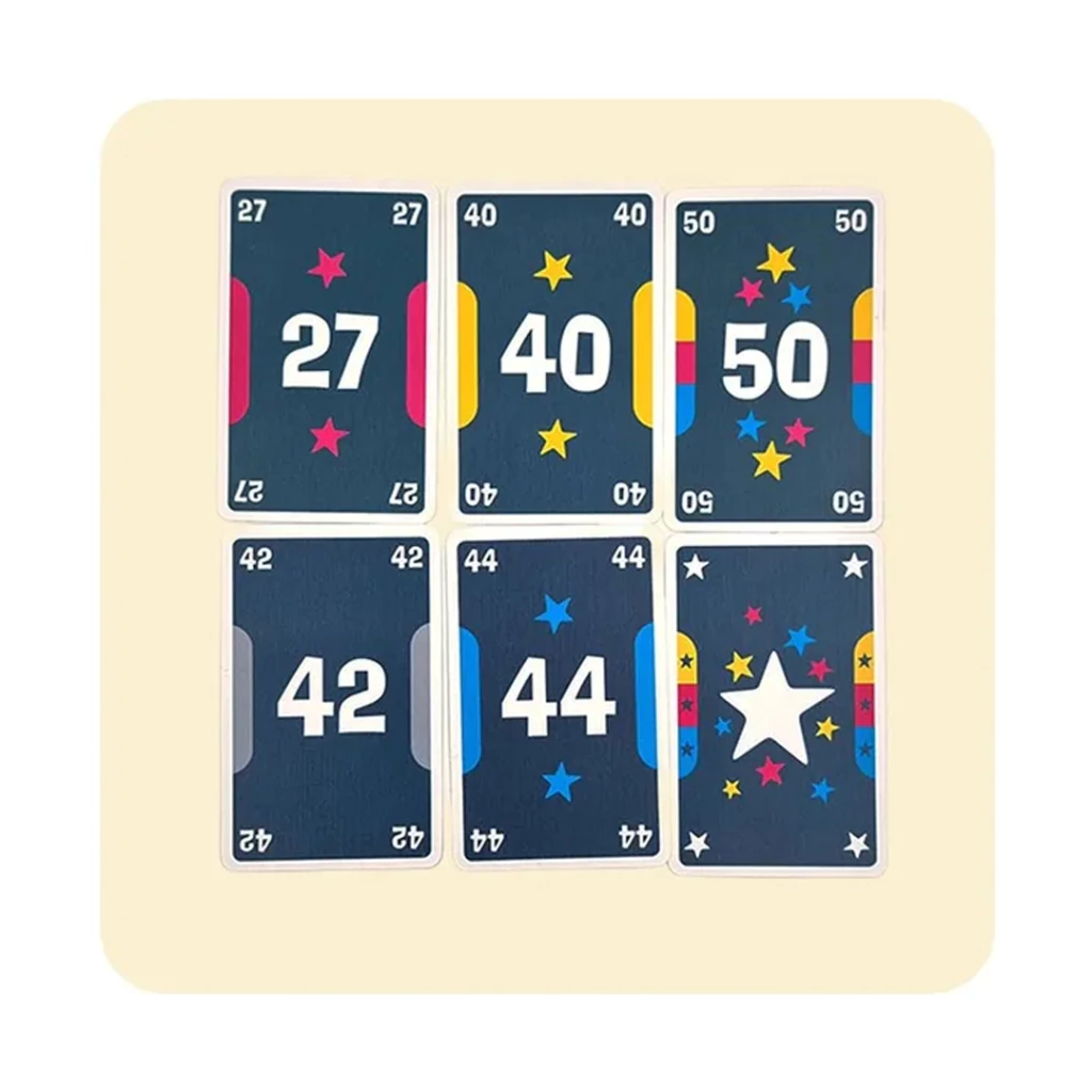 Objetivo del Juego: Logra juntar 3 estrellas para ganar. Cada jugador comienza con 5 cartas y debe ser el último en colocar una carta en el centro de la mesa para obtener una estrella. Las reglas son simples: coloca una carta más alta que la del centro o una de menor valor si comparte el mismo color de estrella.