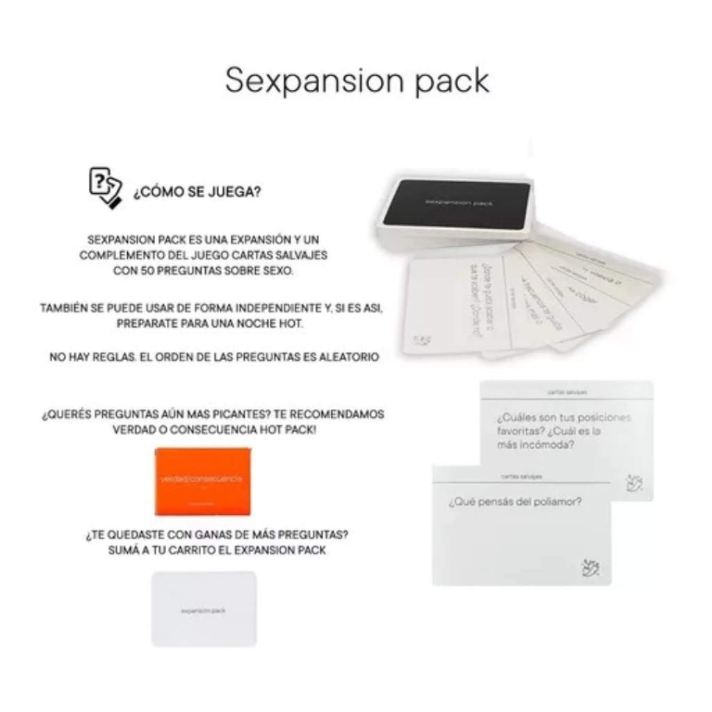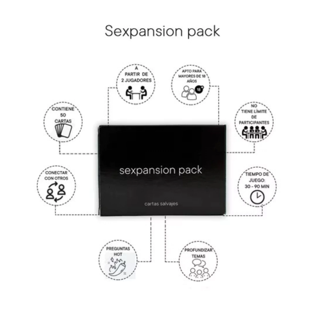 ¡Dale un giro emocionante a tus noches con el Juego De Mesa Sexpansion Pack Cartas Hot! Creado por Ezequiel Churba y Candela Ini durante el confinamiento, este pack de cartas es el complemento ideal para el juego Cartas Salvajes, aunque también puedes disfrutarlo de manera independiente.