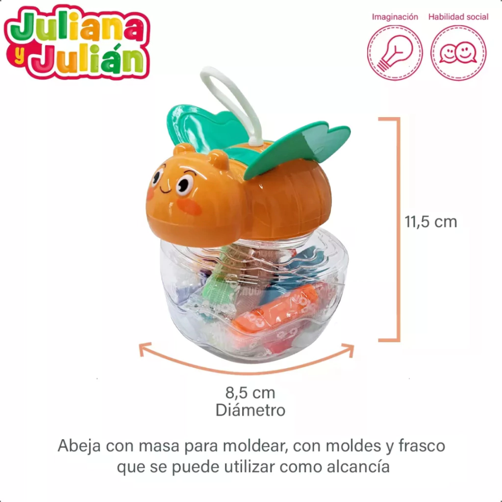 ¡Dejá volar la creatividad con Juliana Y Julián Masas Para Modelar Abeja! Incluye 12 masas coloridas y 2 moldes en un simpático envase reutilizable como alcancía. Su textura suave y no pegajosa estimula la motricidad fina, la imaginación y la coordinación. Recomendado para mayores de 3 años. Medidas: 11,5 cm de alto x 8,5 cm de diámetro. Marca: Juliana.
