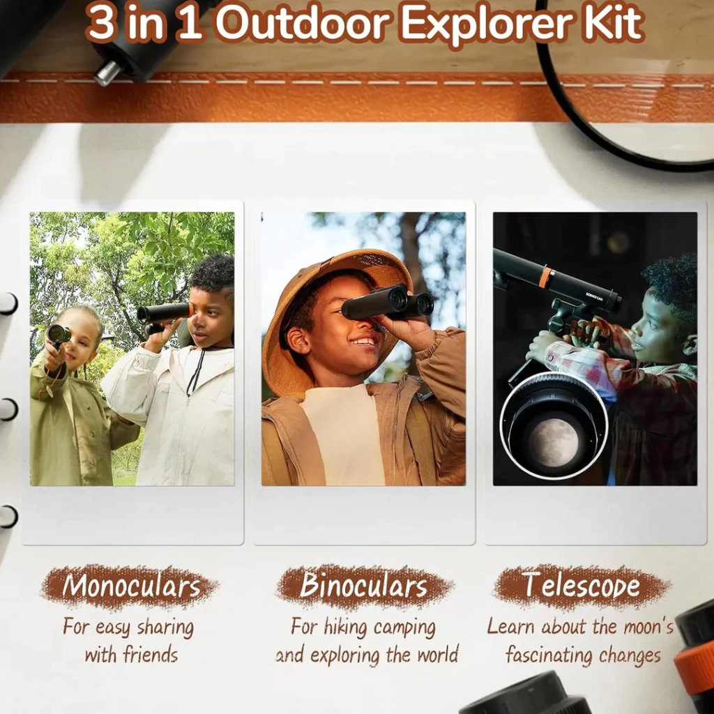 ¡Convertí cada paseo en una gran aventura científica! El Telescopio Binoculares Infantil 3 En 1 16x Con Trípode es el aliado ideal para chicos curiosos (+6 años) que sueñan con explorar el mundo. Este set versátil permite usarlo como monocular, binoculares o telescopio, adaptándose a cada descubrimiento: observá insectos de cerca, admirá aves a la distancia o explorá el cielo nocturno.