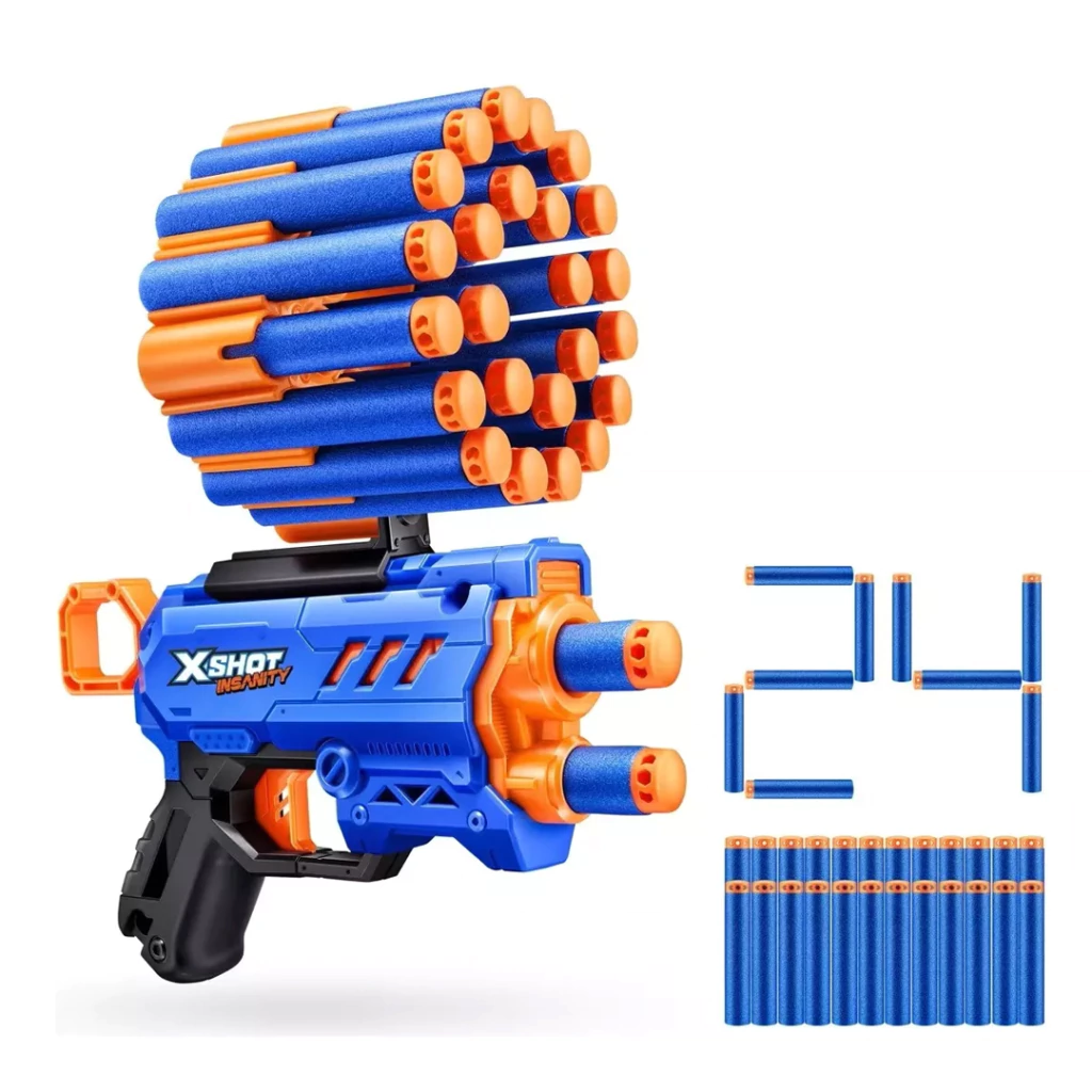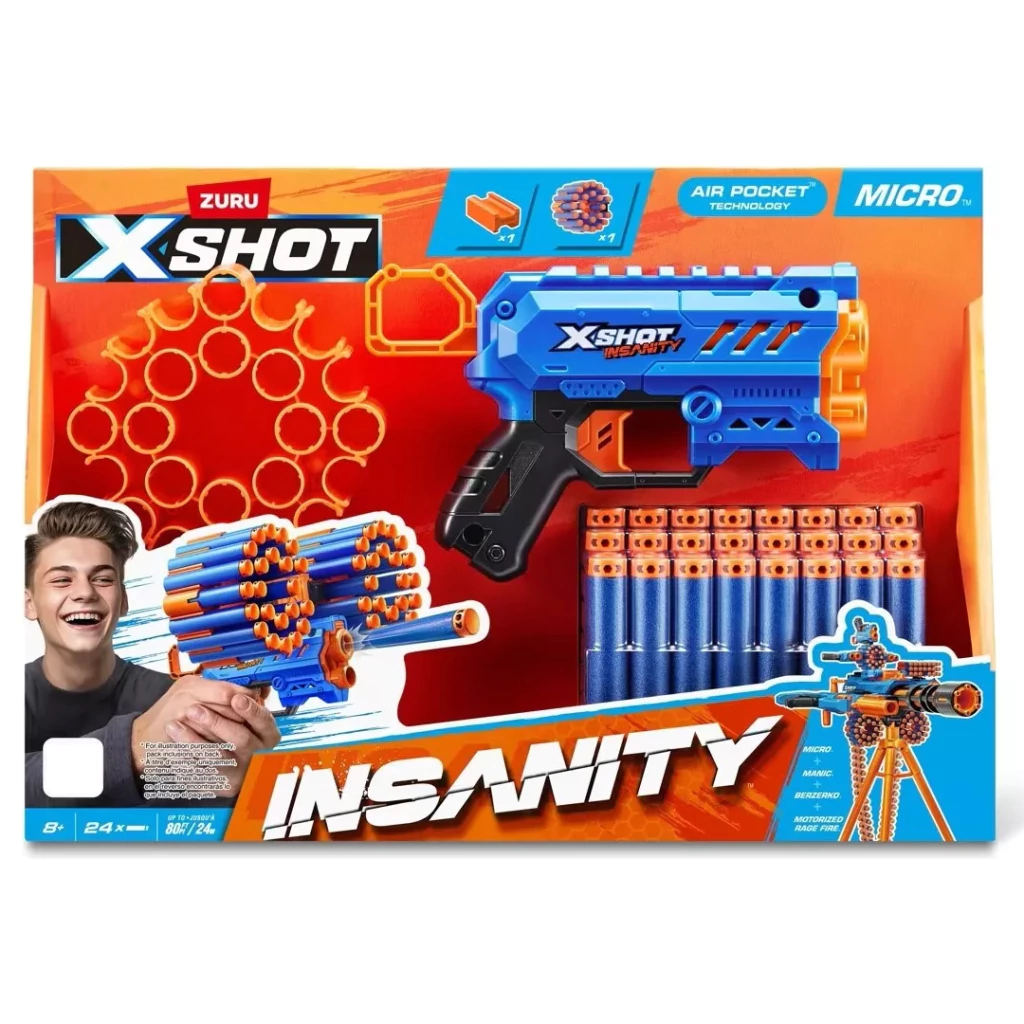 ¡Experimenta la adrenalina con la Zuru X-shot Pistola Insanity Micro 24 Dardos! Este blaster ofrece combos increíbles y munición extra con capacidad para 24 dardos de espuma. Con dos compartimentos modulares, recarga fácil y potencia superior, alcanza a tus oponentes a varios metros. ¡Lleva la última tecnología de dardos a tus batallas!